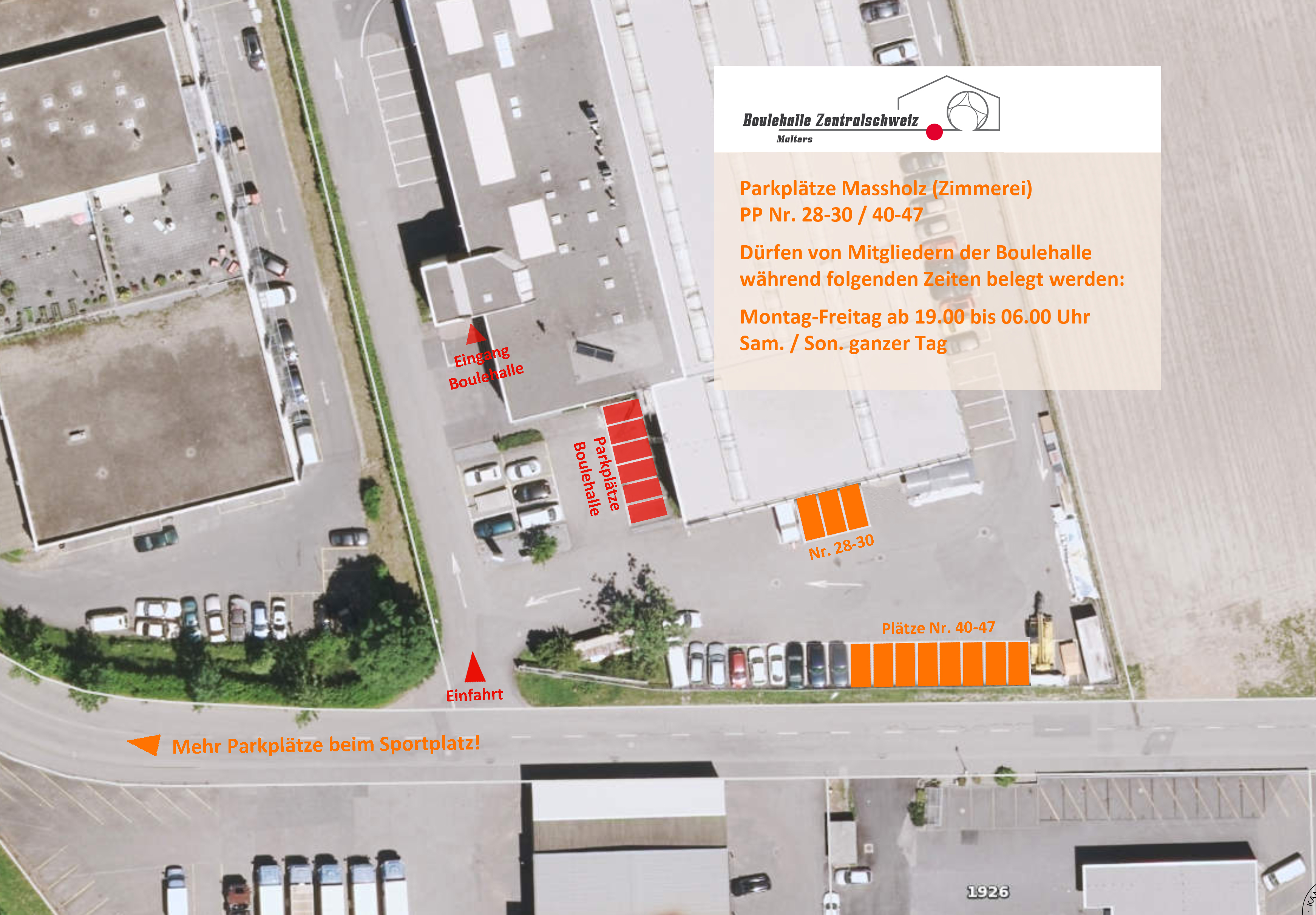 Benutzer/innen der Boulehalle können jederzeit die rot eingezeichneten Parkplätze benutzen sowie ab 19 Uhr und an den Wochenenden die orange markierten Parkplätze.